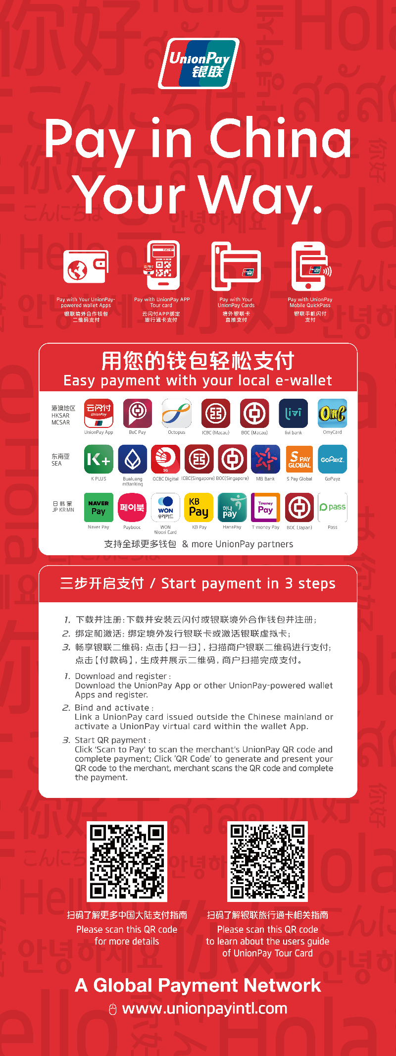 方式二:通過境外移動支付工具掃商戶提供的銀聯二維碼進行支付。港澳居民可直接使用港澳版云閃付或微信或支付寶APP、香港八達通、工銀澳門等港澳本地移動支付工具在廣東省內的銀聯二維碼受理商戶進行掃碼支付。外國居民可通過泰國開泰銀行K PLUS、韓國Never Pay等近170個境外移動支付工具在廣東省內銀聯二維碼受理商戶掃碼支付。